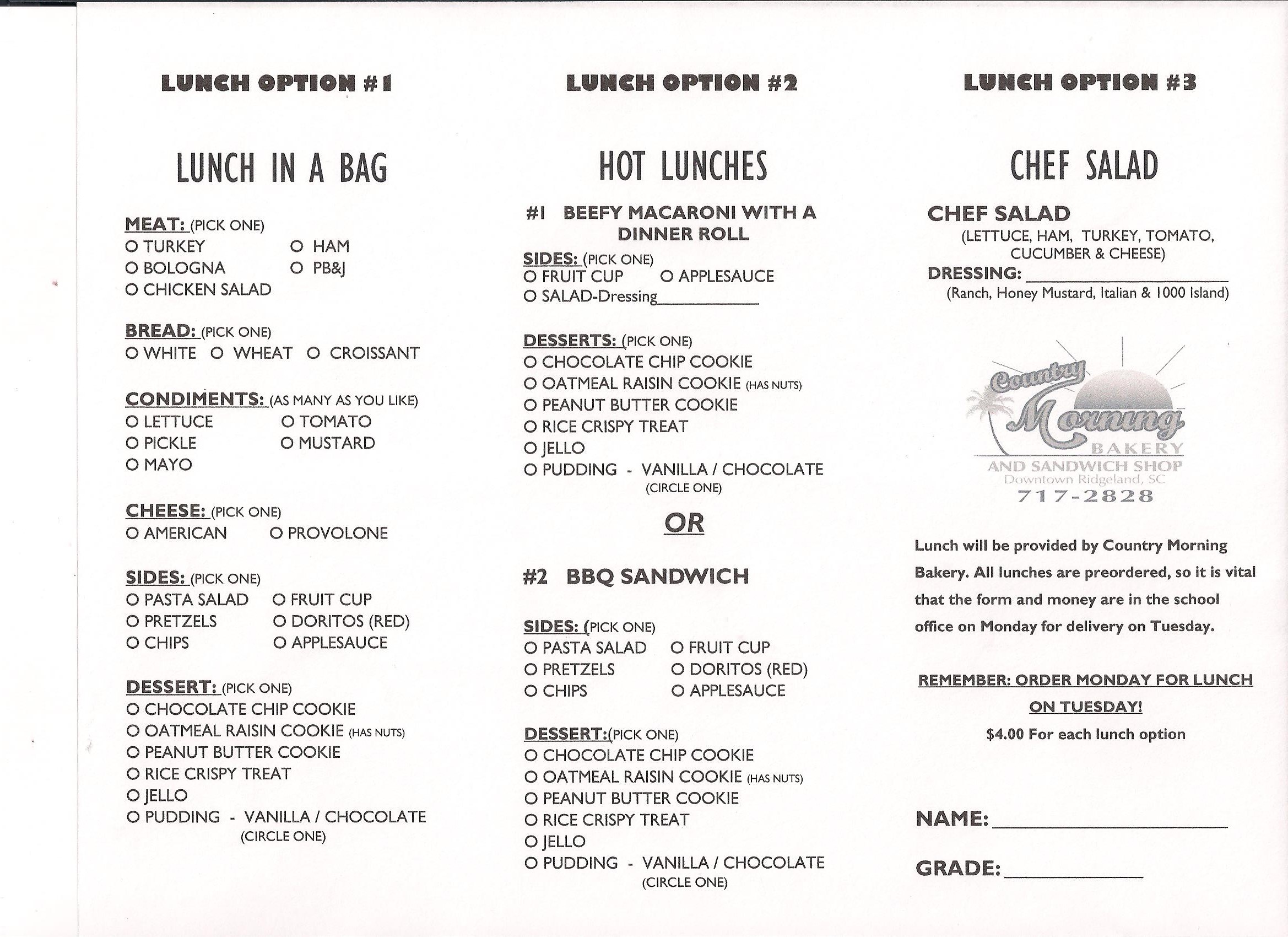 *Money must be in an envelope/bag etc with student's name and grade along with food menu or choice